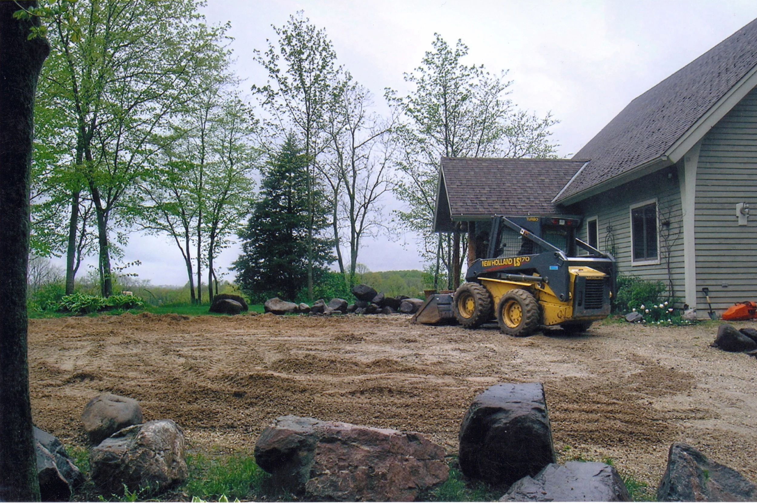 Our client desired comfortable access to a pond located behind their residence.  Before the landscaping project, there was a 30 foot elevation change consisting of uncultivated field grass between the back door and the pond edge.  The meandering lannon pathway/step system now connecting the two areas is several hundred feet long and features a patio of large lannon flag stone and seat rocks perched mid-distance, allowing a lovely view of the surrounding Kettle Moraine, as well as the pond below.